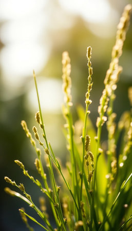 close up of tiny seeds on a weed in the grass with sunlight in the background