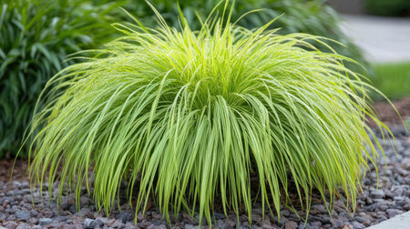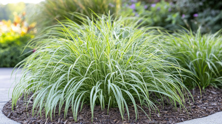 A beautiful cluster of lush green grass strands with delicate texture grows in a tranquil garden, accented by decorative mulch, creating an inviting outdoor space for relaxation.