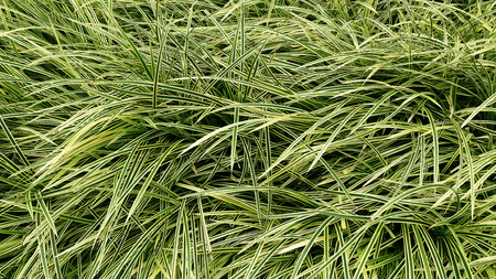 Close snapshot of ornamental grass grown in autumnal park, forest ground. Long green grasses natural wallpaper. Plants with beautiful long leaves. Woods floor. Motley grass grows in a wild grassland.