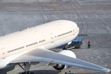 March, 24th, Amsterdam Schiphol Airport the Netherlands: a plane is being pushed back by a tug to avoid jet blast
