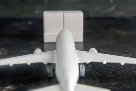 Parcels box and toy airplane on black background with copy space. Air cargo and parcels transportation concept. Fast delivery of goods and products.
