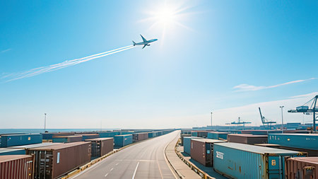 Container Cargo freight ship with plane flying over container terminal. Freight transportation background