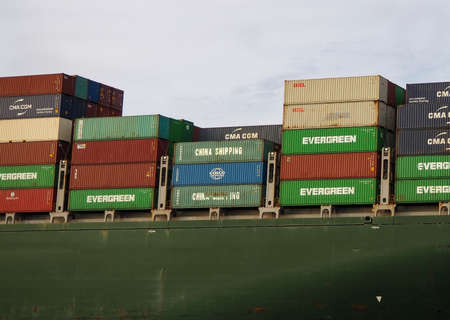 SAVANNAH, GEORGIA - FEBRUARY 22, 2020: Large shipping containers from many different shipping companies are stacked on a cargo ship leaving port, amid a strained climate of delayed and reduced shipping resulting from a virus outbreak in China.
