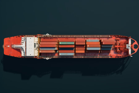 Aerial top view of a container ship navigating global shipping lanes, essential maritime logistics
