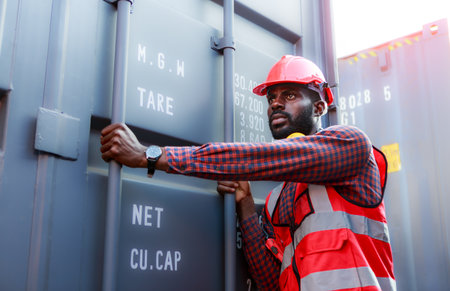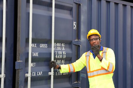 Portrait of an African American male employee or supervisor Wearing a safety helmet, opening containers, checking concepts, moving industrial goods, logistics, import-export. commercial transport