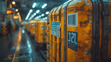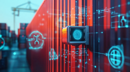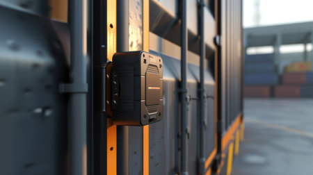 A closeup of a smart tag attached to a shipping container providing realtime location updates and ensuring efficient tracking and delivery of ets