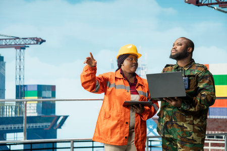 African American black engineer they are working in container box yard area of logistics transportation import export or shipping industry