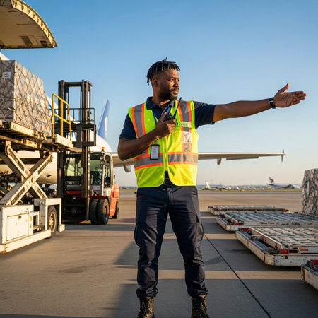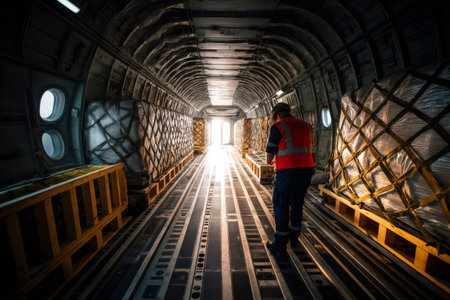 Logistic worker dressed in high visibility clothing, securing pallets within a cargo aircraft, ensuring safe transport of goods