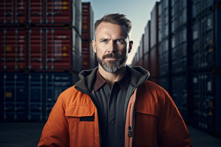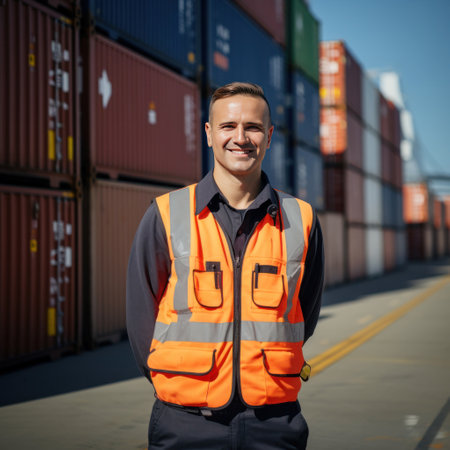 A smiling male logistics coordinator managing harbor operations, surrounded by shipping containers, ensuring efficient and timely delivery of cargo.