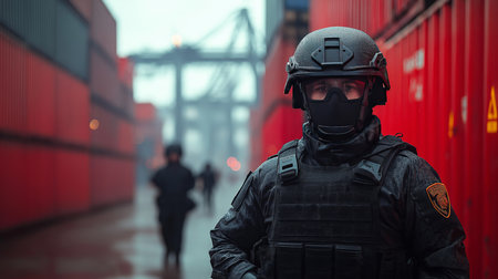 Soldier in military uniform and helmet near cargo containers, representing defense, transport security, and logistics.