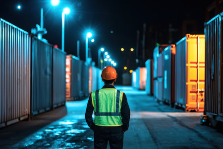 A safety supervisor in a high visibility vest inspects a truck at night in an industrial container yard, showcasing safety practices and management oversight in a well-lit environment.