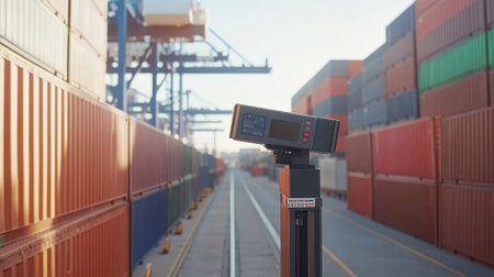 A digital measuring device stands prominently in an industrial port, surrounded by colorful shipping containers and cargo stacks, showcasing modern logistics and transportation practices.