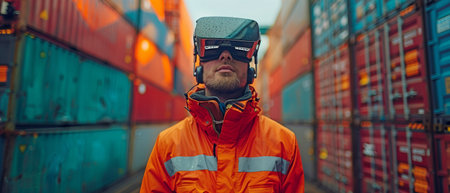 Employee Utilising VR Vision Pro Technology Devices Headset Device Use at Construction Sites in Container Yards: Innovation in the Logistics Sector