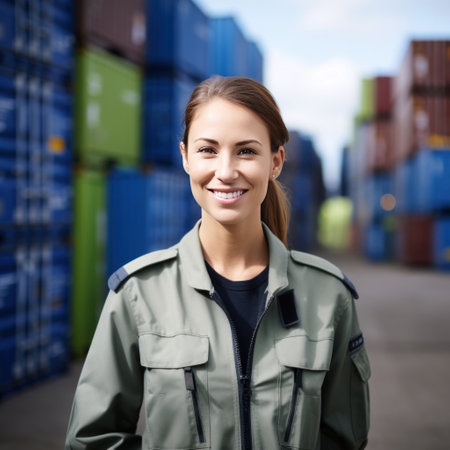 A smiling female logistics coordinator managing harbor operations, surrounded by shipping containers, ensuring efficient and timely delivery of cargo.