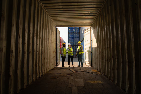 Group of workers in an empty container storage yard, The condition of the old container is being assessed to determine whether it requires maintenance for usage.