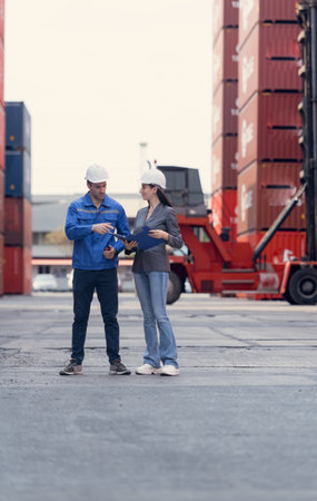 Two foreman man & woman worker working checking at Container cargo harbor to loading containers. Dock male and female staff business Logistics import export shipping concept.