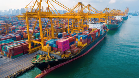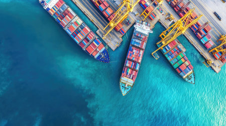 Aerial freight shipping hub with multiple cargo ships, cranes handling import and export logistics