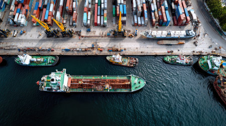 This aerial photograph showcases a bustling maritime port filled with tankers and cargo containers, emphasizing the dynamics of shipping and trade.