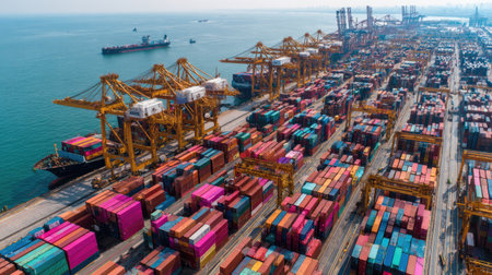 This aerial image captures a bustling shipping port filled with colorful cargo containers and cranes, highlighting the logistics and maritime industry.