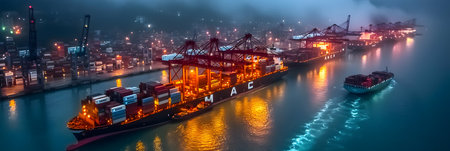 Large container ships docked at a bustling industrial port at night, illuminated by bright lights from cranes, with long exposure light trails on the water reflecting the vibrant activity of global trade and logistics.
