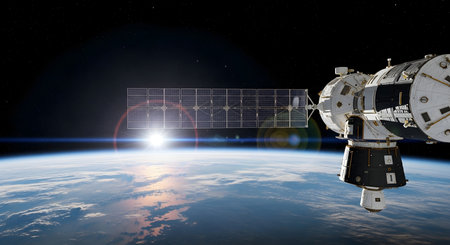 A detailed view of a spacecraft orbiting Earth, featuring intricate engineering and modern technology in space.
