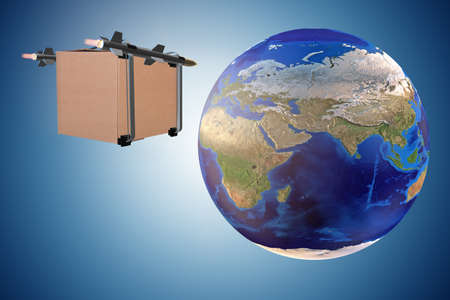 USA space exploration technologies concept illustration. Cargo spaceship in open space. Business and technology theme 3d render
