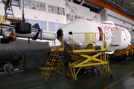 BAIKONUR, KAZAKHSTAN - DECEMBER 18, 2011: Soyuz spacecraft capsule is being mated with its booster rocket in the Integration facility building at the Baikonur cosmodrome