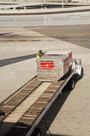 Kansai, Japan Oct 27,2017 : Cargo containers loaded into an airliner for cargo and baggage in Kansai International Airport.