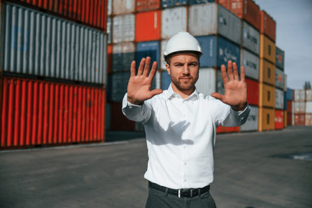 Engineer man Team in Safety Gear Control Containers Box at Container Cargo, Container Yard Workers Team Discussion at Shipping Yard