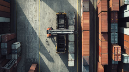 Aerial top view of heavy cargo containers stacked during unloading at a shipping dock in port