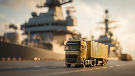 Modern Logistics: Sleek Truck Transporting Cargo near Dock with Ships in Background