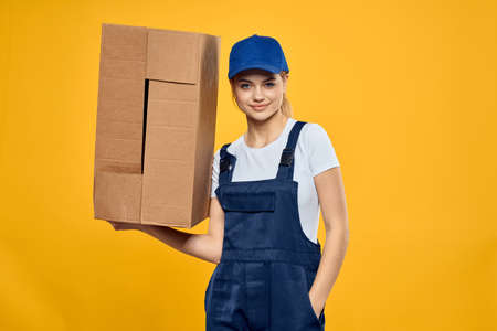 Working woman in uniform box in hands delivery courier service rendering yellow background