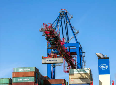 Hamburg, Germany, May 11, 2019: A container ship of the COSCO shipping line is loaded at the HHLA facility in the port