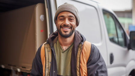 A smiling male delivery worker in front of his van. Transport. Generative Ai