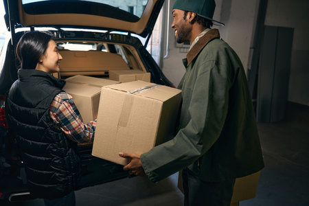 Professional warehouse worker working together to load product from car at storage. Skilled project manager using loading and delivery using hands carry the box. Delivering online order. AIG42.