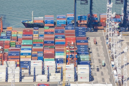Hong Kong, China - Jun 15, 2015: Container ship unloading at the Kwai Tsing Container Terminals in Hong Kong