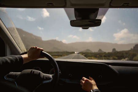 Car interior at sunrise on a forest road. Traveling with car concept. car insurance concept