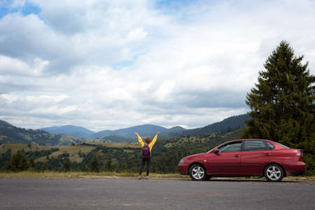 Woman hand on the car relaxing and happy traveler with mountain background