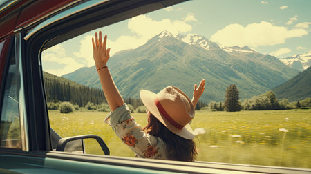 Happy woman waving hand outside open window car with meadow and mountain background. Female lifestyle relaxing as traveler on road trip in holiday vacation. Transportation and travel