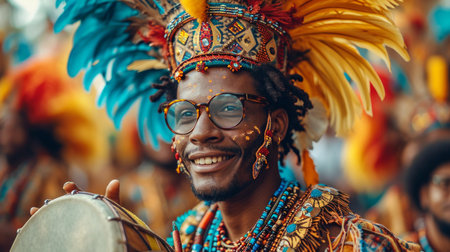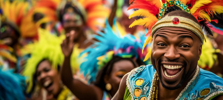 Excited African-American man with colorful feathers enjoying a festive carnival parade