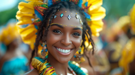 Joyful woman in traditional colorful costume and headdress smiling during a lively street carnival parade. Celebrating culture, happiness, and community in a festive atmosphere.