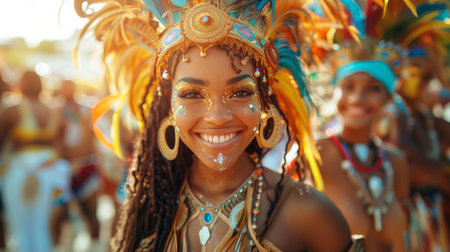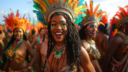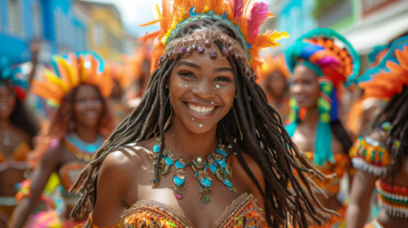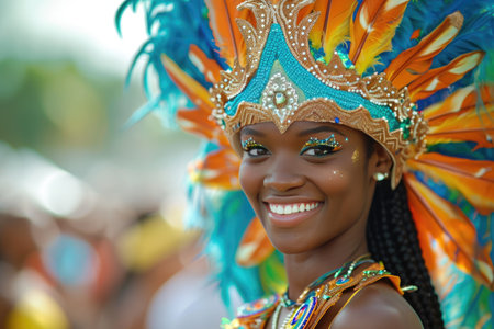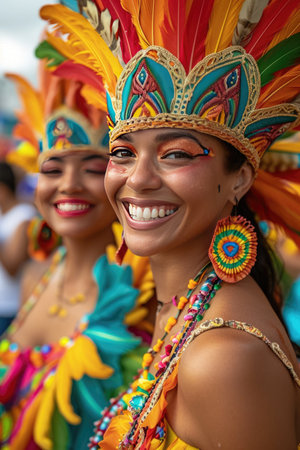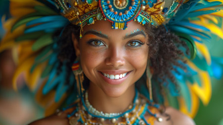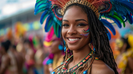 Vibrant portrait of a joyful woman dancer adorned in a colorful feathered costume at a lively carnival parade, showcasing cultural expression and festivity.