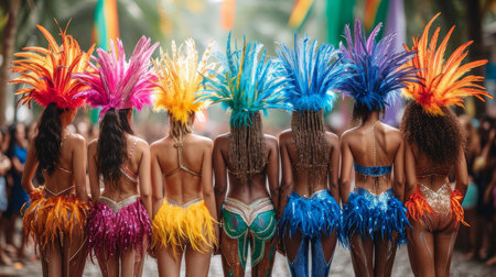 A stunning display of vivid colors and spirited carnival atmosphere as a group of girls showcase their dazzling costumes and feather headdresses.
