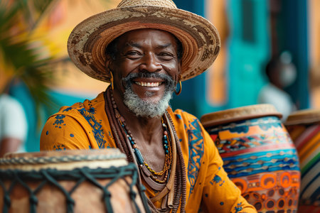 Joyful Senior Street Musician Playing Traditional Drums, Celebrating Culture and Music