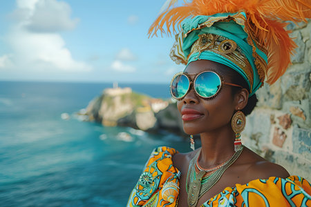 Vibrant African Woman in Traditional Attire Overlooking Sea
