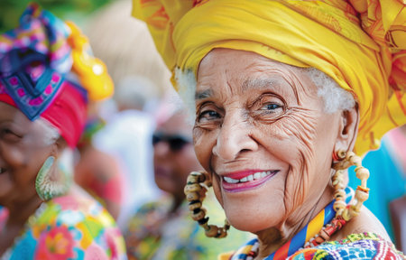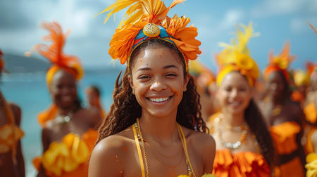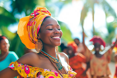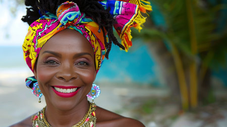 Smiling Woman In Colorful Headdress, Celebrating Caribbean Culture With Joy And Heritage
