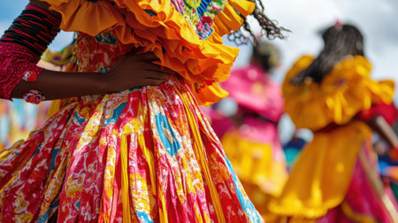 Dancers wear vibrant, ruffled dresses adorned with bright colors, showcasing their heritage at a lively outdoor festival, celebrating culture and community during summer.