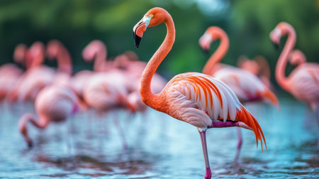 A serene scene featuring a flock of flamingos gracefully standing in calm waters, reflecting their vibrant pink hues against a bright sky. Ideal for nature lovers.