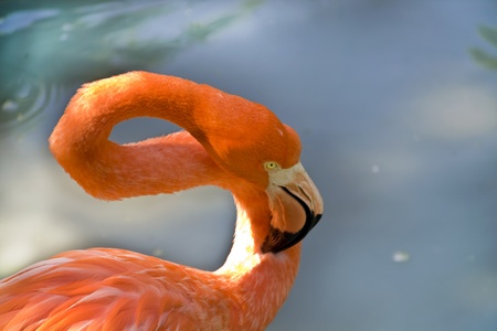 American flamingo is grooming its pink and orange feathers in a tropical setting