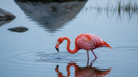 A vibrant pink flamingo stands gracefully in shallow water, its reflection mirroring its beauty. The serene scene captures the essence of natures elegance.